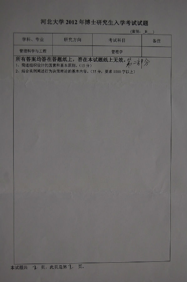 河北大学2012考博真题:管理科学与工程专业管理学