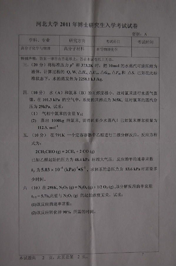 新东方在线为报考河北大学管理学院的考博考生整理了河北大学高分子化学与物理专业高等物理化学1考博真题,供考生参考。