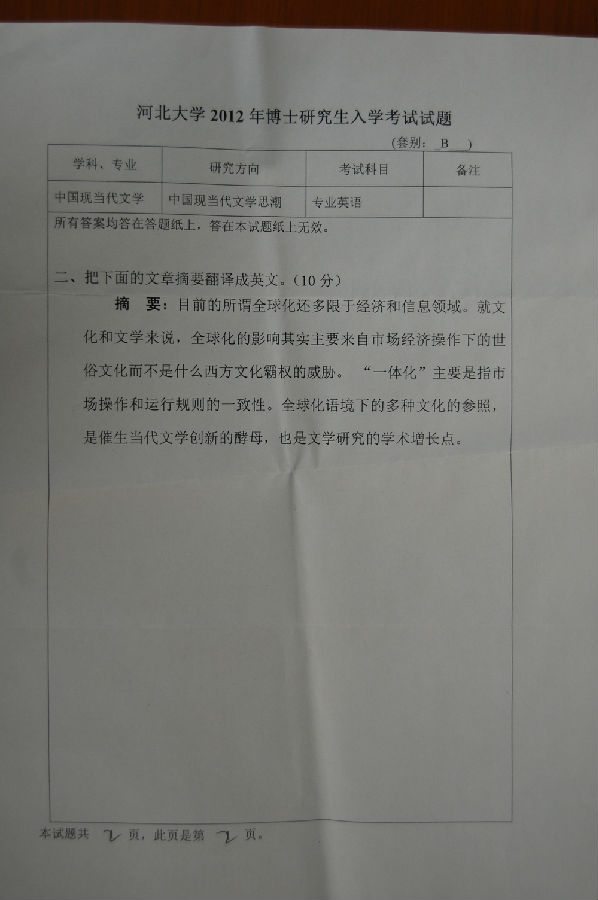 河北大学2012考博英语真题:中国现当代文学专业英语