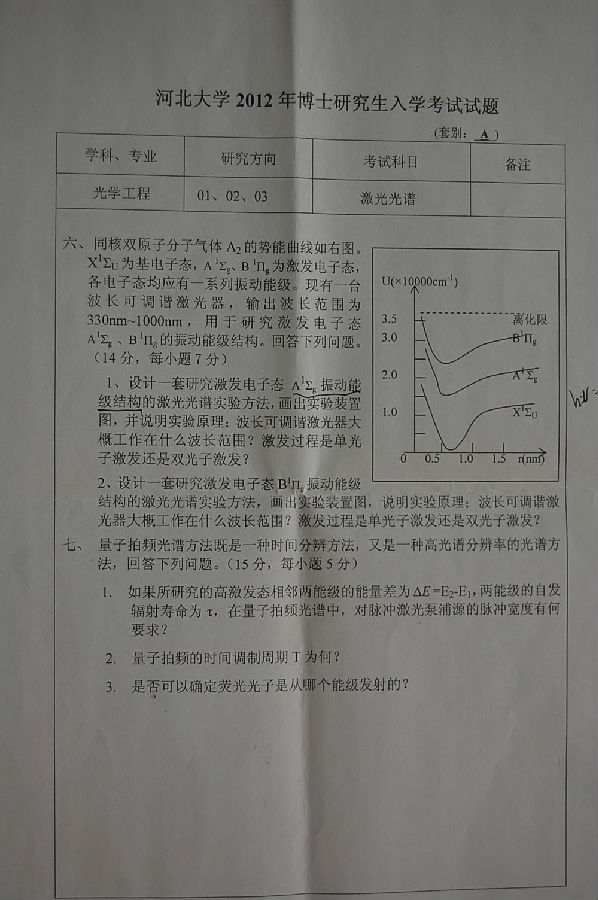 河北大学2012考博真题:激光光谱