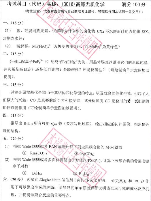 广东工业大学2014年高等无机化学考博真题