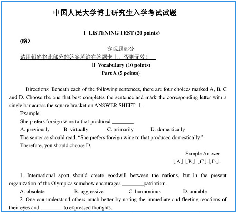 考博英语是每个研究生院招收博士研究生都有的科目,考博生们在进行考博英语复习的时候研究生院历年的考博英语真题是不可多得的重要资料,新东方在线考博频道整理了2009年中国人民大学考博英语真题给大家,希望考博生们考博成功。