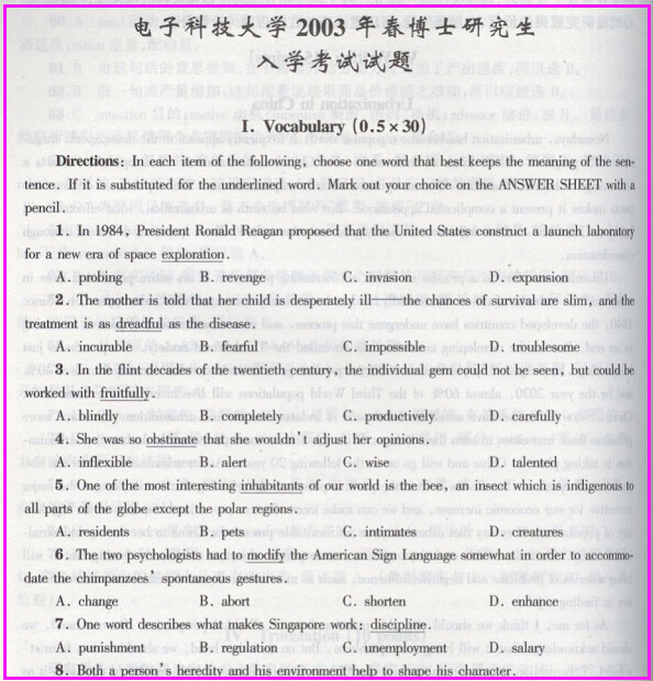 考博英语是每个研究生院招收博士研究生都有的科目,考博生们在进行考博英语复习的时候研究生院历年的考博英语真题是不可多得的重要资料,新东方在线考博频道整理了2003年电子科技大学考博英语真题给大家,希望考博生们考博成功。