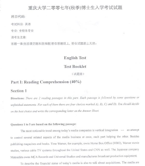 考博生们在进行考博英语复习的时候研究生院历年的考博英语真题是不可多得的重要资料,新东方在线考博频道整理了2007重庆大学考博英语真题给大家,希望考博生们考博成功。