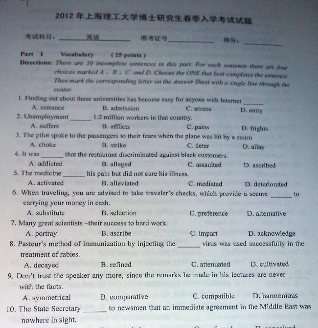 上海理工大学2012考博英语真题