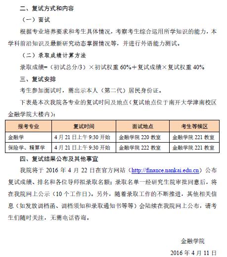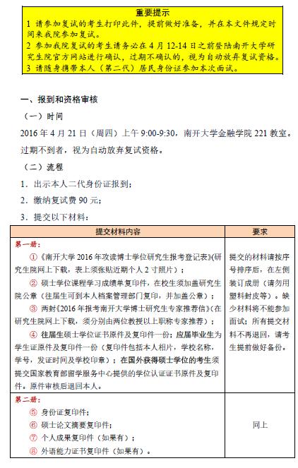 南开大学金融学院2016考博复试时间及安排