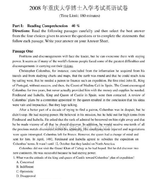 考博生们在进行考博英语复习的时候研究生院历年的考博英语真题是不可多得的重要资料,新东方在线考博频道整理了重庆大学2008考博英语真题给大家,希望考博生们考博成功。