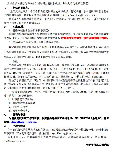 同济大学电子与信息工程学院2016考博复试分数线及复试安排