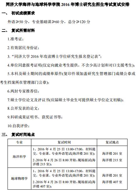 同济大学海洋与地球科学学院2016考博复试分数线及复试安排