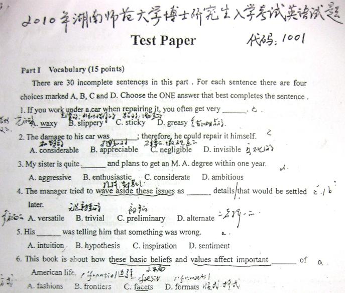 考博生们在进行考博英语复习的时候研究生院历年的考博英语真题是不可多得的重要资料,新东方在线考博频道整理了湖南师范大学2010考博英语真题给大家,希望考博生们考博成功。