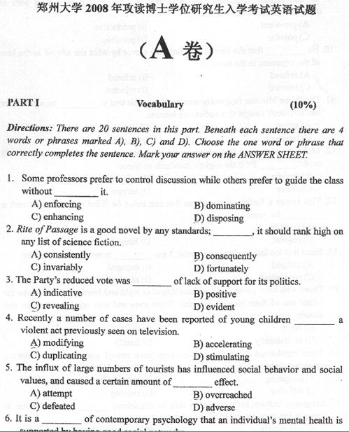 考博生们在进行考博英语复习的时候研究生院历年的考博英语真题是不可多得的重要资料,新东方在线考博频道整理了郑州大学2008年考博英语真题给大家,希望考博生们考博成功。