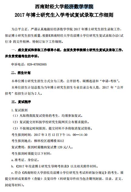 西南财经大学经济数学学院2017年博士研究生招生复试细则