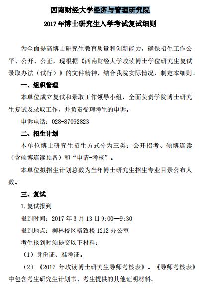 西南财经大学经济与管理研究院2017博士研究生招生复试细则