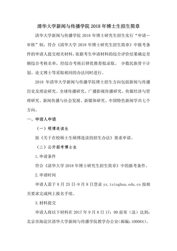 清华大学新闻与传播学院2018年博士研究生招生简章
