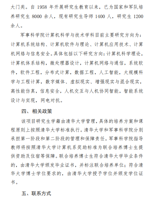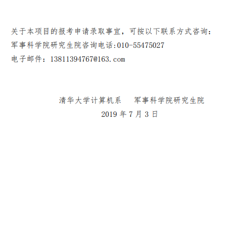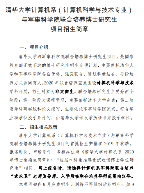 2020年博士研究生招生入学考试工作已经展开,新东方在线考博频道将为广大2020考博考生发布转载各博士招生单位发布的2020年博士研究生招生简章、考博专业目录、考博参考书目、及导师联系方式,请考博考生密切关注新东方在线考博频道。更多考博备考资料及考博真题请收藏新东方在线考博频道,以下是清华大学计算机系与军事科学院联合培养2020博士生招生简章。