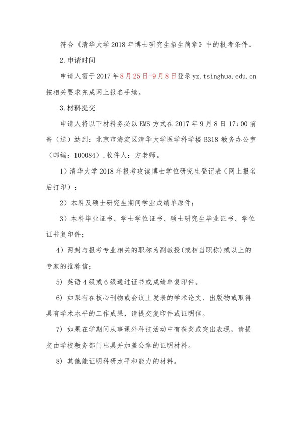 清华大学医学院(基础医学系)2018年博士研究生招生简章