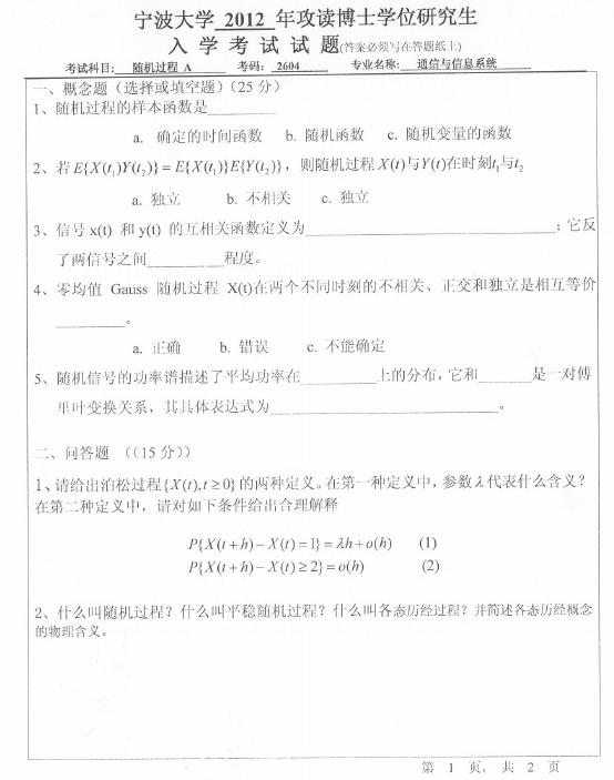 宁波大学2012年随机过程考博真题  考博真题是考博考生复习难得并且十分重要的复习自测资料,新东方在线考博频道为考生们整理了宁波大学2012年随机过程考博真题供考生们参考复习。