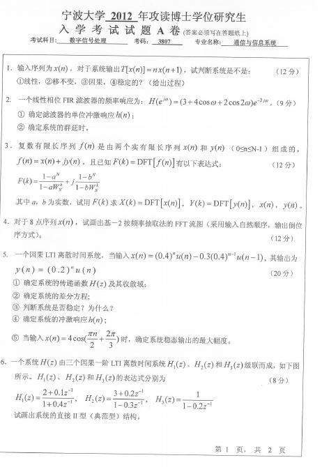 宁波大学2012年数字信号处理考博真题  考博真题是考博考生复习难得并且十分重要的复习自测资料,新东方在线考博频道为考生们整理了宁波大学2012年数字信号处理考博真题供考生们参考复习。