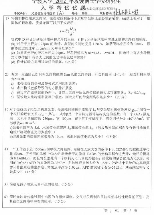 宁波大学2012年光通信理论与技术考博真题  考博真题是考博考生复习难得并且十分重要的复习自测资料,新东方在线考博频道为考生们整理了宁波大学2012年光通信理论与技术考博真题供考生们参...