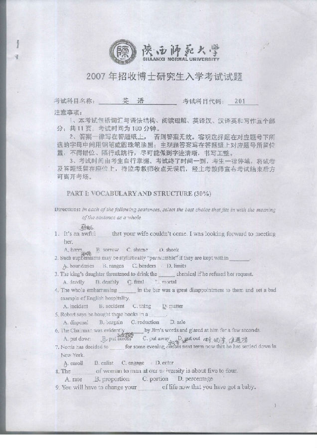 以下是2007年陕师大考博英语真题回顾,更多资讯请继续关注新东方在线考博频道。[page][page][page][page]